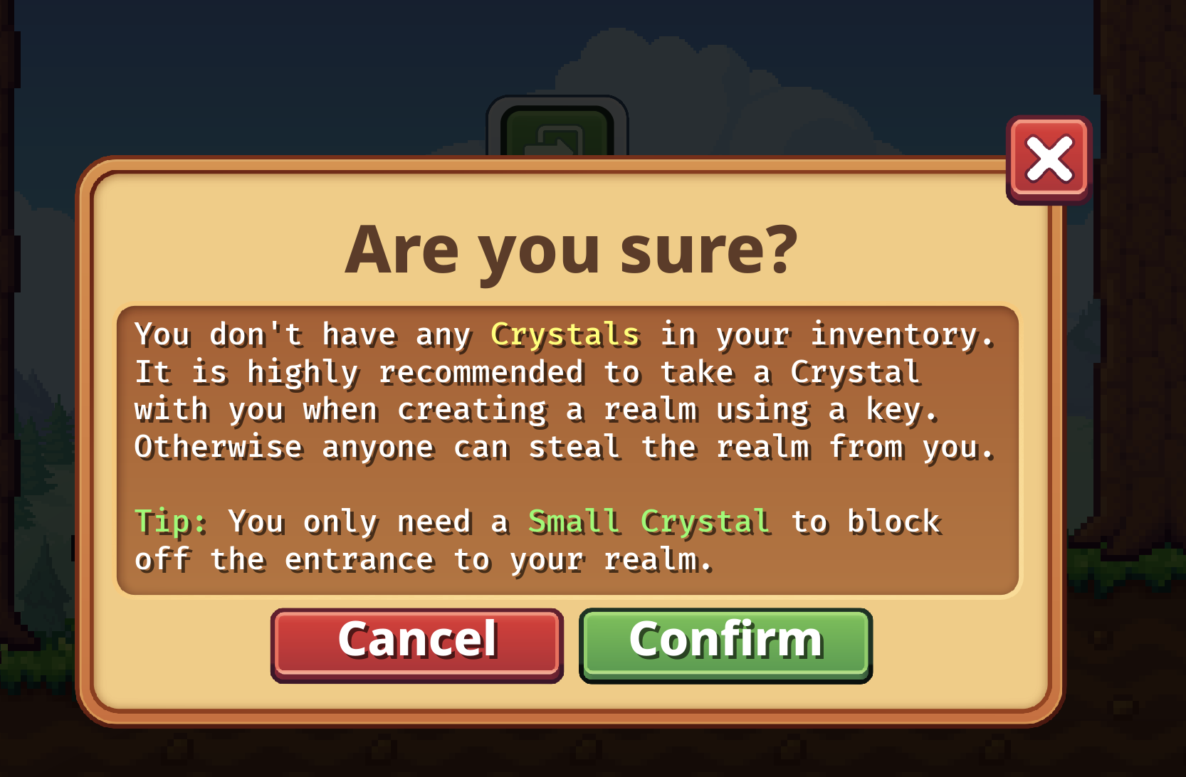 Another example would be the little popup messages we added with this update. If you mine diamond ore with a golden pickaxe, the game will tell you, “Golden tools trade block drops for shards!" If you use a realm key on the realm entrance, a popup says, “Keys can only be used on wooden doors." Similarly, if you use a world key without any crystals in your inventory, a warning popup will appear. These were all considered common mistakes beginners would make.